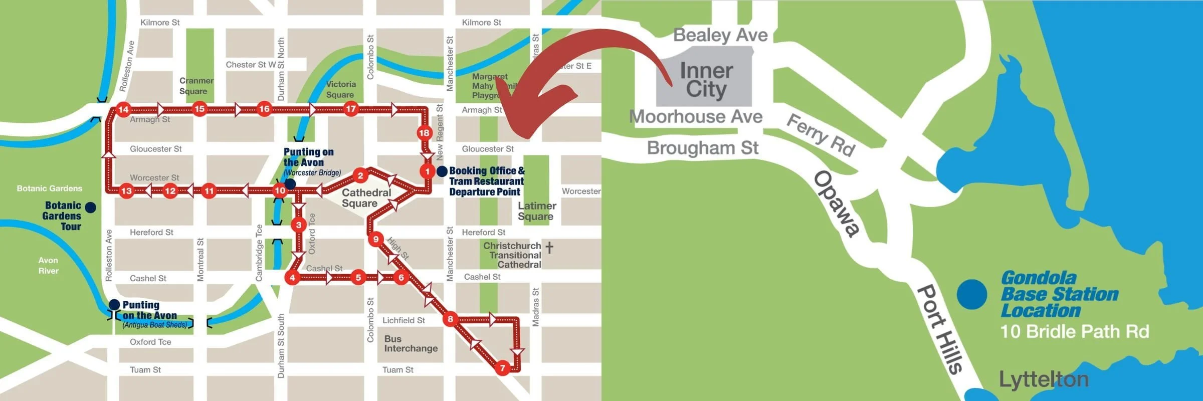 Christchurch Gondola (10 Bridle Path Road, Heathcote): our Gondola Shuttle operates between Cathedral Square in the central city and the Christchurch Gondola on cruise ship days. The shuttle departs from Cathedral Square on the half hour from 9:30am until 3:30pm, and from the Christchurch Gondola on the hour from 10am until 4pm. $15 return and $10 one-way tickets can be purchased from our Tram Hosts at Tram Stops 2 and 4, or from the driver (please note only card payments are accepted for onboard fares). The #8 public bus that operates between Lyttelton and central Christchurch stops at the Gondola base station (please note that only cash payments are accepted for onboard fares which are $4 per journey). Cruise ship visitors wanting to travel to the Gondola from Lyttelton can catch the #8 public bus towards the Airport, and guests wanting to visit the Gondola on the way back from Christchurch can catch the #8 public bus towards Lyttelton from the Christchurch Bus Interchange on the corner of Colombo and Lichfield Streets. Guests can also choose to travel via taxi or rideshare service.